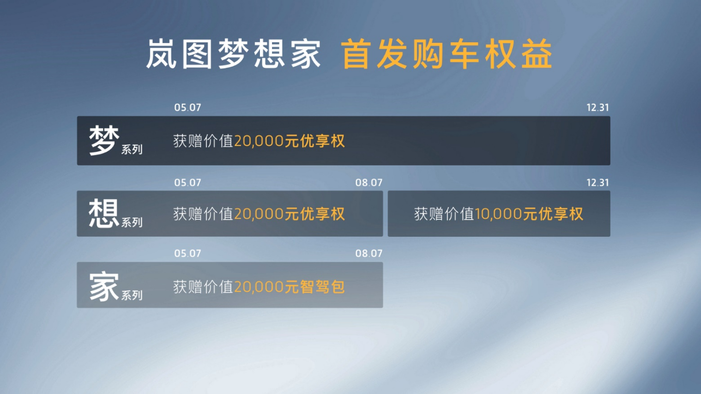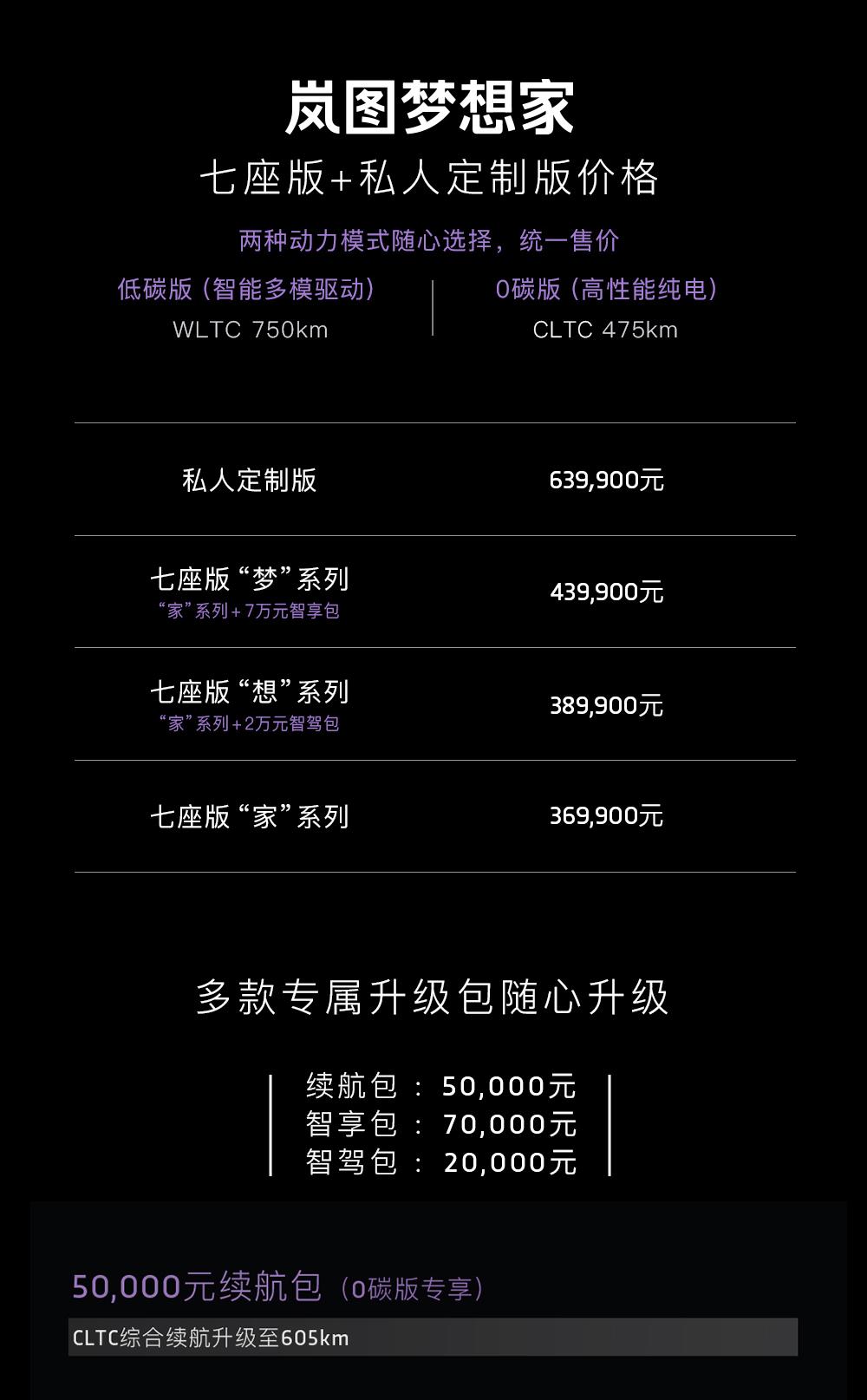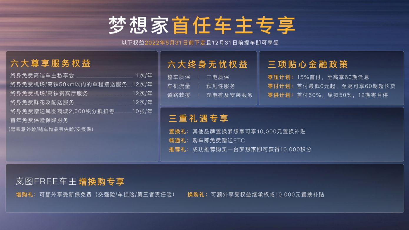 【2022年5月7日,武汉】全球首款电动豪华旗舰MPV岚图梦想家正式上市,七座版售价36.99万元-43.99万元,私人定制版售价63.99万元起,用户可通过岚图汽车APP预定。岚图梦想家拥有17项MPV首搭技术,21项同级领先技术,将电动、智能、性能、舒适、安全融为一体,堪称MPV电动时代分水岭,将引领MPV进入智能化、电动化时代。自4月7日开启预售,岚图梦想家已收到超4000个订单,预计将于今年第三季度起开启交付。 岚图汽车CEO兼CTO卢放表示:“岚图梦想家是生而不同的全新物种,将开创电动MPV这一新品类,也将建立起电动豪华MPV新标杆,引领MPV进入电动化、智能化的新时代。岚图梦想家是一款宜商宜家的车,岚图已与多家头部企业签订购车协议,岚图汽车也将助力每一个企业的梦想,为用户创造价值,共绘美好中国梦。岚图汽车会继续践行国内最好的服务标准,让每一位车主都成为MPV上的MVP。” 岚图梦想家分为“梦”系列、“想”系列、“家”系列,其中:“家”系列369,900元,“想”系列389,900元,“梦”系列439,900元,私人定制版售价639,900元起,用户可通过岚图汽车APP预定。 除了硬核产品力带来的豪华新体验,岚图汽车还为梦想家七座版用户带来多项限时权益。8月7日前下单“家”系列的用户,可获赠价值20000元的专属升级包; 8月7日前下单“想”系列的用户,可获得20000元的优享权,8月7日至12月31日下单“想”系列的用户,可以获得10000元的优享权;今年内下单“梦”系列的用户,可享受20000元优享权。 岚图梦想家搭载岚海动力 是ESSA原生高端智能电动架构的战略之作 岚图梦想家是岚图汽车推出的第二款具有里程碑意义的战略车型,是全球最低碳出行的MPV,也是全球最舒服的MPV。作为智能电动豪华MPV的开创者,岚图梦想家填补了现有MPV在智能、性能、舒适、豪华方面的缺失,未来的MPV们将以岚图梦想家为起点,开启低碳出行和高端向上的发展阶段。 区别于以往传统燃油MPV,岚图梦想家诞生于ESSA原生高端智能电动架构,是基于全球首个双动力高端原生电动架构打造的MPV。ESSA是国内电动汽车首个完全自主模块化架构,具有天生智能、极致安全、随心操控、全方位舒适四大优势。岚图汽车新一代动力系统“岚海动力”就搭载于ESSA架构,它是目前唯一的双动力技术平台,以用户需求为核心,拥有超级动力、高效节能、便捷补能、极致安全四大优势。 “岚海动力”可支持高性能纯电和智能多模驱动两种动力方案,分别应用于岚图梦想家0碳版、岚图梦想家低碳版。其中,高性能纯电驱动技术搭载行业效率最高的八层扁线电机,提高了电机的功率和效率。智能多模驱动技术采用东风自研1.5T GDI“中国心”十佳发动机,热效率达41.07%,同时匹配可智能切换的动力模式,支持特定场景下的发动机直驱。得益于智能多模驱动技术,岚图梦想家低碳版可油可电,工信部综合油耗低至1.99L/100km,相当于1.2T的油耗就可爆发出媲美3.0T的动力,实现了动力性和经济性的完美平衡。 岚图梦想家0碳版搭载最大功率为160kW/160kW的前后双电机,峰值扭矩620N·m,百公里加速可达5.8秒,电池最高支持230kW功率快充,20%~80%电量时充满仅需约20分钟,标准续航版CLTC续航里程 475km,长续航版CLTC续航里程 605 km。岚图梦想家低碳版搭载最大功率分别为 130kW/160kW的前后双电机,峰值扭矩610N·m,百公里加速6.6秒,WLTC续航为750km。两款车型极速最高可达200km/h,动力输出充沛平顺。 五大领先优势 岚图梦想家引领MPV豪华出行新体验 岚图梦想家拥有17项MPV首搭技术,21项同级领先技术,为MPV用户带来颠覆性的极致用车体验。岚图梦想家不仅是目前行业中唯一采用双动力布局的电动MPV,更是第一款搭载高通8155车机芯片、具有L2+智能驾驶辅助、遥控泊车功能与三联屏座舱的MPV。作为一款生而不同的“全新物种”,岚图梦想家凭借舒适空间、舒享豪华、温暖科技、全域安全、极致性能等领先优势,率先迈入MPV低碳出行时代,建立起电动豪华MPV的全新标准。 相较于传统MPV,岚图梦想家在舒适性上全方位领先。岚图梦想家轴距达3200mm,标配豪华双侧电滑门,拥有灵活自如的2+2+3七座、私人定制版2+2四座布局,座座皆首席。作为移动的挑高大平层,岚图梦想家满载7人无需放倒第三排,仍可轻松装载四个24寸行李箱,既可使每个乘员都乘坐舒适,多人出行的行李也能安放妥当。全车提供 41 处储物空间,得益于电驱系统的优势,0碳版车型提供40L前备厢,安全又私密。 岚图梦想家不仅拥有顶尖的舒适空间体验,更创造了全方位碾压同级的豪华新高度。作为全球首款搭载空气悬架+CDC、具备魔毯功能的新能源MPV,岚图梦想家通过智能调节减振器阻尼,实现行政级轿车的驾乘质感。高速时空气悬架自动降低车身高度,降低风阻及能耗,上下车或取放行李时,车身高度降低,带来尊贵的仪式感。岚图梦想家还拥有铝合金前双叉臂+后五连杆的百万级底盘实力,相较于传统燃油MPV,实现了车辆通过性、行驶稳定性、乘坐舒适性与上下车便利性的有效平衡。 岚图梦想家配备了零重力宽适座椅,二排独立座椅拥有70°大角度电动腿托及最大后旋角度155°靠背,同时配有睡眠头枕,具备3档加热通风和按摩功能,采用OEKO-TEX生态纺织品认证的婴儿防护级亲肤面料,提供极致尊贵的乘坐体验。三区智能空调,纯净的空气管理及丹拿音响系统,带来沉浸式舒享放松体验。岚图梦想家全车多达八十余处隔音降